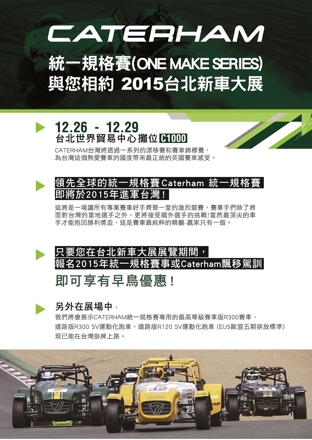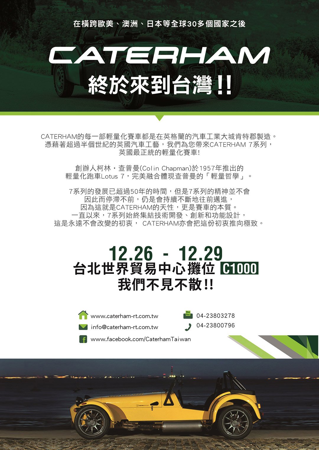 Caterham Taiwan將在12/26在台北世貿與大家見面,歡迎喜歡Caterham的各位來現場共襄盛舉